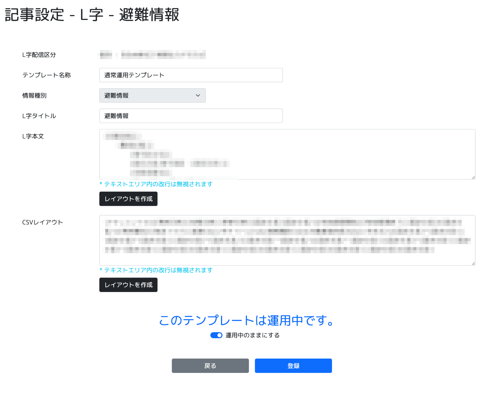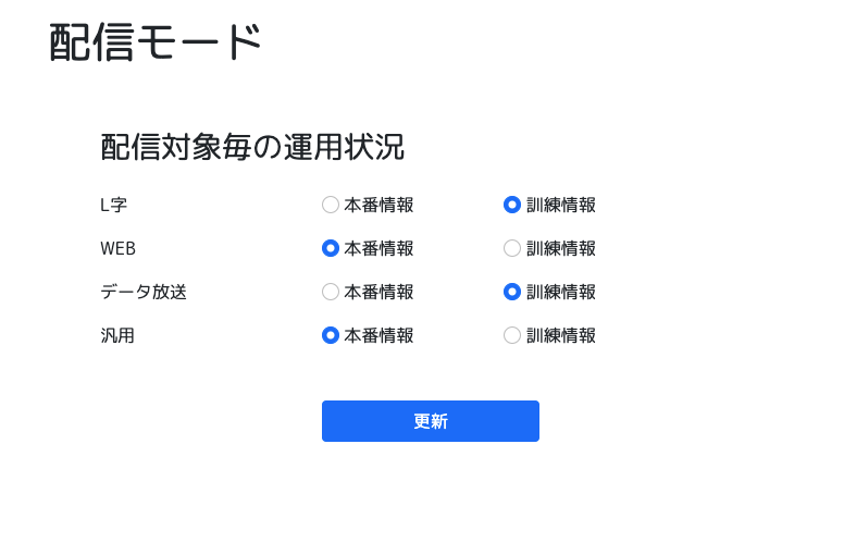 毎年開催される全国訓練や、自治体毎の個別訓練も対応可能です。 操作はいたって簡単で、WEB画面より切り替えるだけです。 配信情報には文頭に強制的に「訓練」の文字が文頭に入り、また、配信ファイル中に識別値を設定することが可能です。