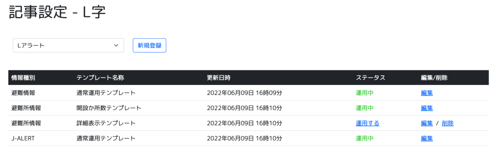| Lアラート® | 気象情報 | 鉄道情報 | ... | |